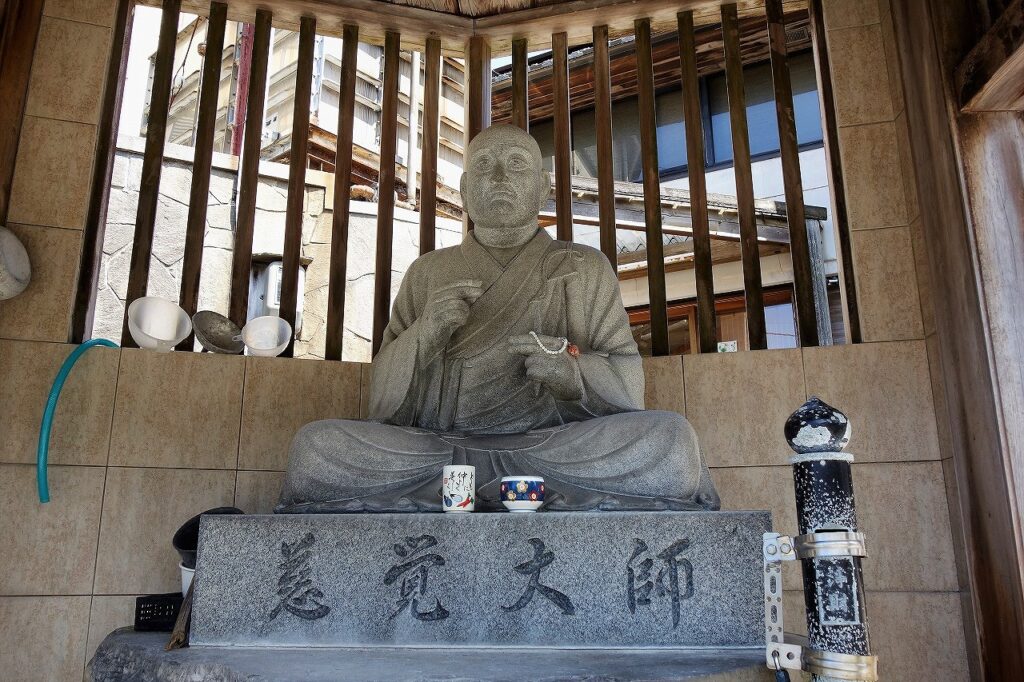 兵庫県美方郡新温泉町湯(ゆ)の湯村温泉源泉「荒湯」に「慈覚大師像」がある。観光客がゆで卵を作っている。
