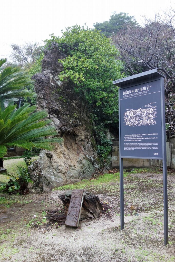 屏風か衝立のように岩が立っている。危険だから入るなと注意書きがあるが、確かに風化が進んでおり脆いように見える。ここで有名な「国譲り」が行われたというのだ。1300年前の日本書紀が遥か昔のこととして記録した説話だから、その古さは計り知れない。説明板を読んでみよう。