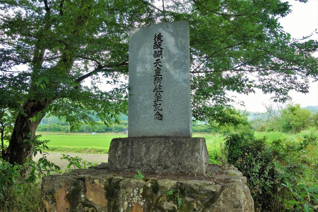 石碑には「後醍醐天皇御駐輦記念」と刻まれている。駐輦とは「天子が行幸の途中で車を止めること」であるが、後醍醐天皇の場合は島流しとなって移送されていたに過ぎない。しかし、そんな突き放した物言いはせず、「御遷幸」などと敬意を込めて呼ぶこととなっている。裏側の碑文を読んでみよう。