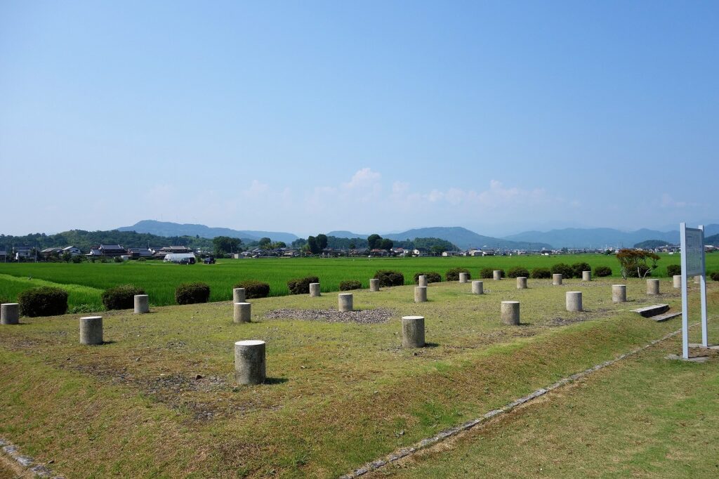 柱跡は、御影石の円柱で表現し、建物の規模は盛土で表現しています。