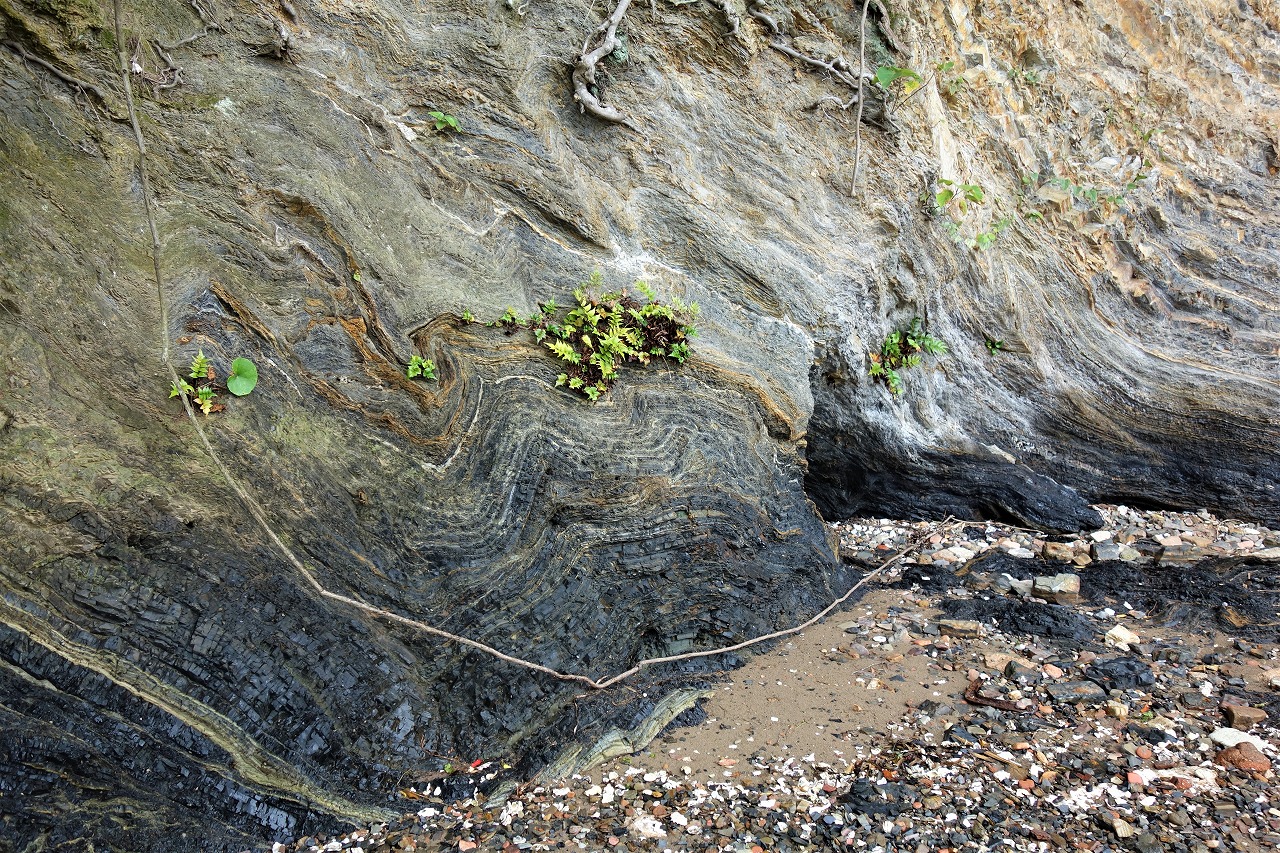 これは堆積当時水平であった地層が横からの圧力のために波状に曲がったものです。