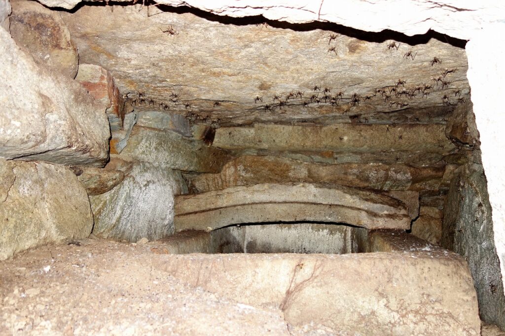 石室の入口は狭く、中は真っ暗で何がなんやら分からない。カメラを持つ手を伸ばしてシャッターを切ると、二番目の写真のように美しい石棺が写っていた。説明板には次のように記されている。