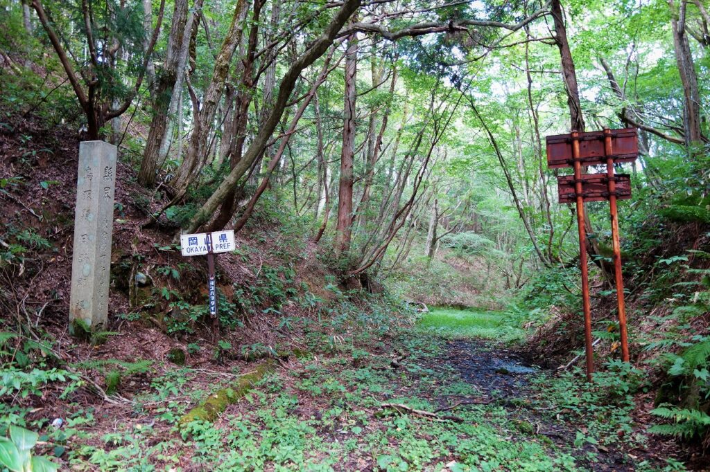もっとも出雲街道の峠はここではなく、もう少し北を通過している。そこには行かず、廃道マニアでもないのに、旧国道の荒れ具合が気になって長靴に履き替え、ここまでやってきた。峠の石柱は少々埋もれているが「県界 東宮殿下行啓記念 岡」「鳥取県日野郡根」「岡山県真庭郡新」「大正十五年五月」の文字を確認できる。