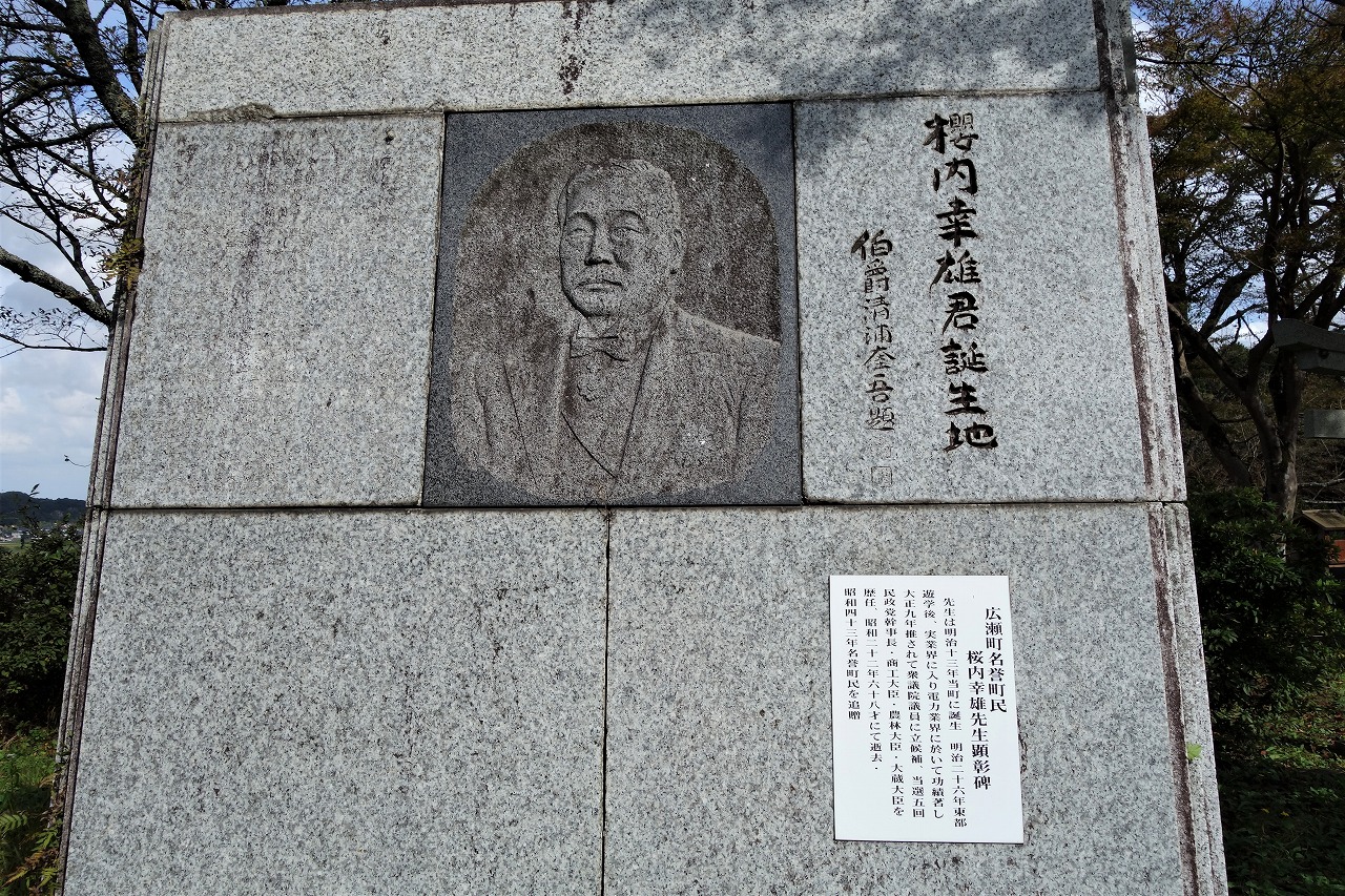 安来市広瀬町富田の月山富田城跡、千畳平の入口に「櫻内幸雄君誕生地」の石碑がある。裏面に「昭和十八年十月 櫻内先生頌徳會建之」とあるが、『出雲富田城史』によれば、実際に建てられたのは昭和二十八年だという。