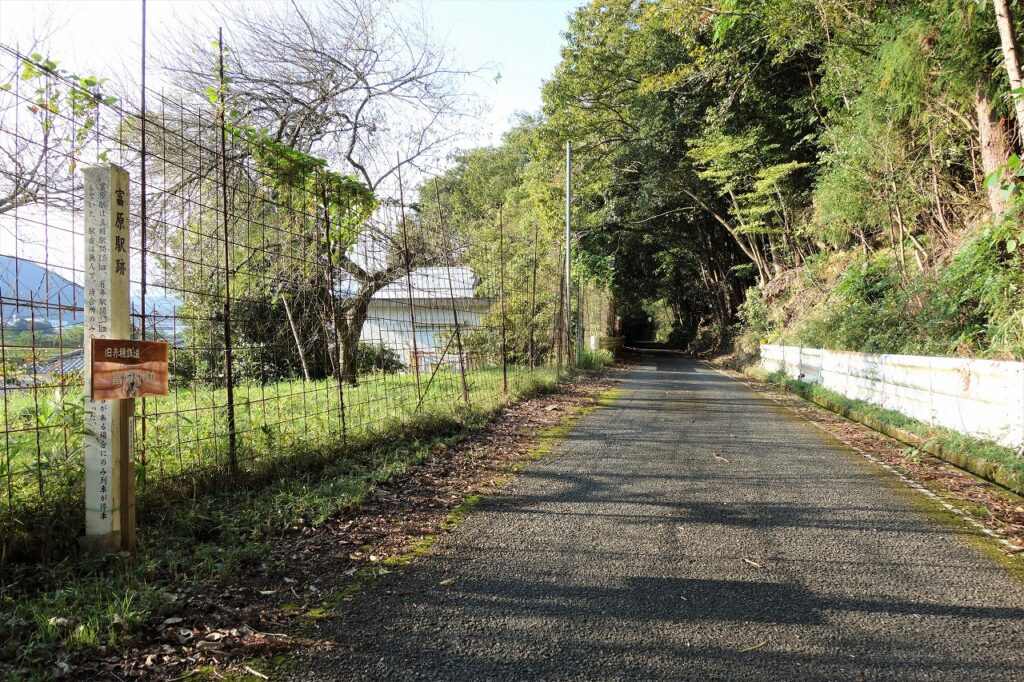 廃線跡は兵庫県道525号周世有年原線として活用されている。勾配の少ない山裾の狭い道だから、ドライブというよりサイクリングによさそうだ。標柱の説明を読んでみよう。