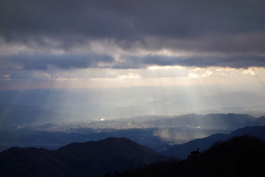 光芒が津山の市街地を照らしていた。光る筋は吉井川だ。まさに神の降臨、光の筋が作州の中心部を遠望できることを教えてくれた。これぞ爪ヶ城のレゾンデートルである。いくつかの山城を烽火の合図で中継して、敵の動向を知らせようとしたのではないか。高所にあれば見えやすいということだ。