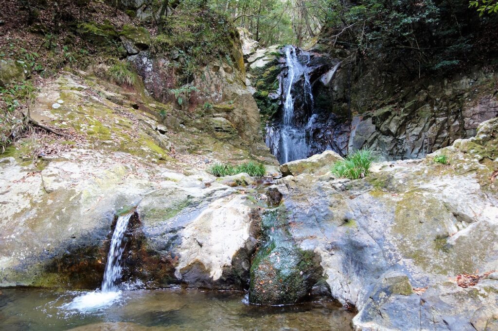 牛鬼の棲む滝壺とはこのことだろうか。神社の背後に優しい名前の「琴引きの滝」がある。市の名勝に指定されている。高さ13mで雄滝と雌滝の二段構成である。滝壺に牛鬼が潜むような恐ろしさはない。水の流れは自然の滝というより、日本庭園に設えた人造の滝のようだ。雨の直後なら岩の黒ずんだ部分を激流が迸るのだろう。