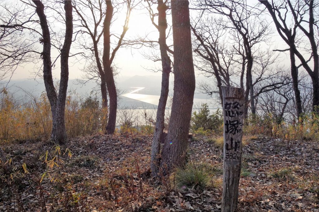 そしてもう一つが、児島最高峰の金甲山の手前に屹立する山、怒塚(いかつか)山の怒塚城である。特に児島湾三大山城という呼称があるわけではないが、標高の高い城跡で、相互に一望することができる。