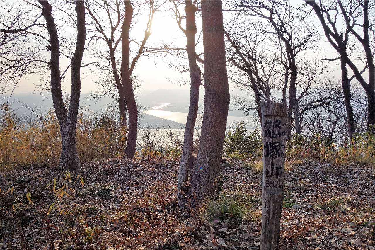 岡山市南区郡と玉野市八浜町見石の境に「怒塚(いかつか)城跡」がある。怒塚山332mの頂上にあり、削平地は広い。写真正面に光る鴨川の向こうに常山307mが見えている。