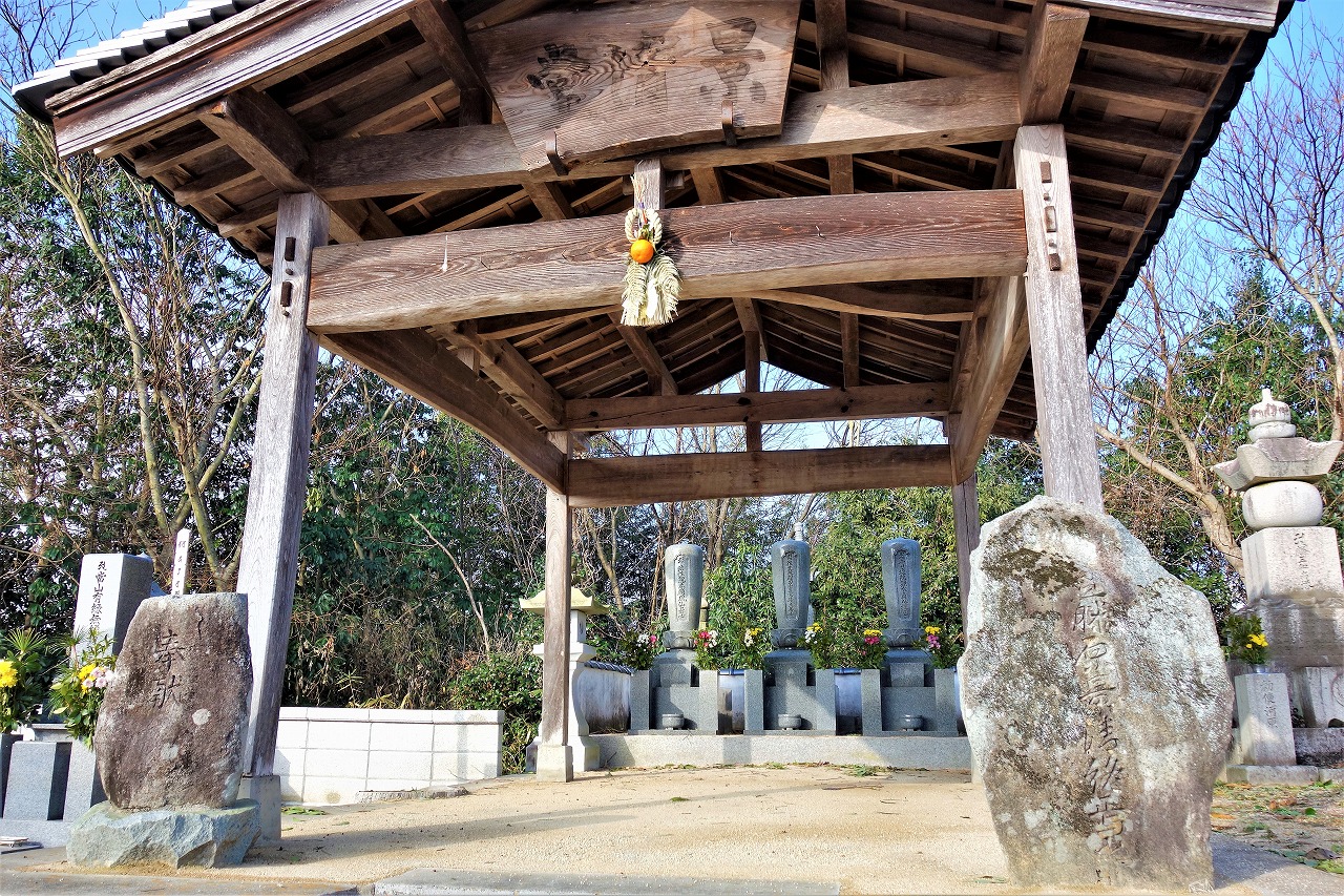 堂の奥には新しい墓石が三基あり、真ん中が景清、右は景清の母、左は景清母子の供養のためにお堂を立てた一族の景明である。近くに説明板があるので読んでみよう。