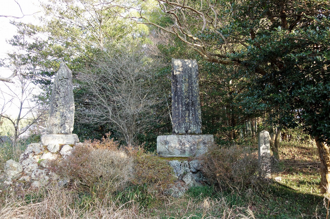 城跡といっても険しい山城ではなく居館跡で、石碑の北側に土塁が確認できる。説明板がないので城主の名が分かりにくいが、右側の黒っぽい石碑が手掛かりとなる。碑には「贈正五位植月重佐碑」と刻まれている。「正二位勲一等菅原修長書」とあるから、こちらは高辻修長(たかつじおさなが)子爵の揮毫である。