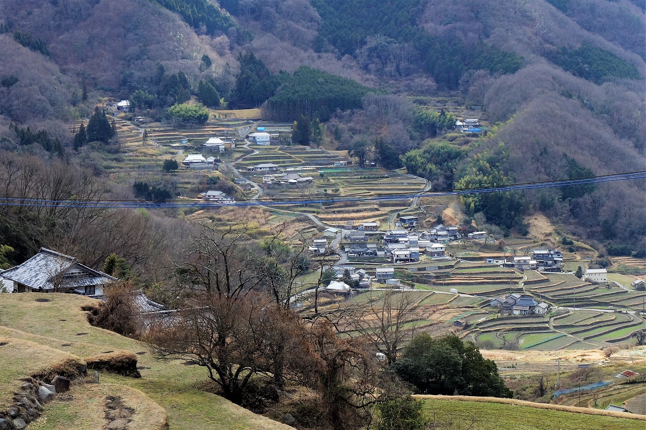 この日、私は大芦高原の方面から下りてきたのだが、等高線を思わせる風景を斜面に見て、思わず車を停めた。扇形に開けた谷に広がる棚田を高所から眺望できるので迫力がある。『角川日本地名大辞典33岡山県』の「田土」には、次のように記されている。