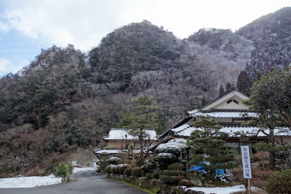 「弥治郎生誕の地」に生家跡があり、その向こうにぬぼっとした感じの「弥治郎嶽」がある。