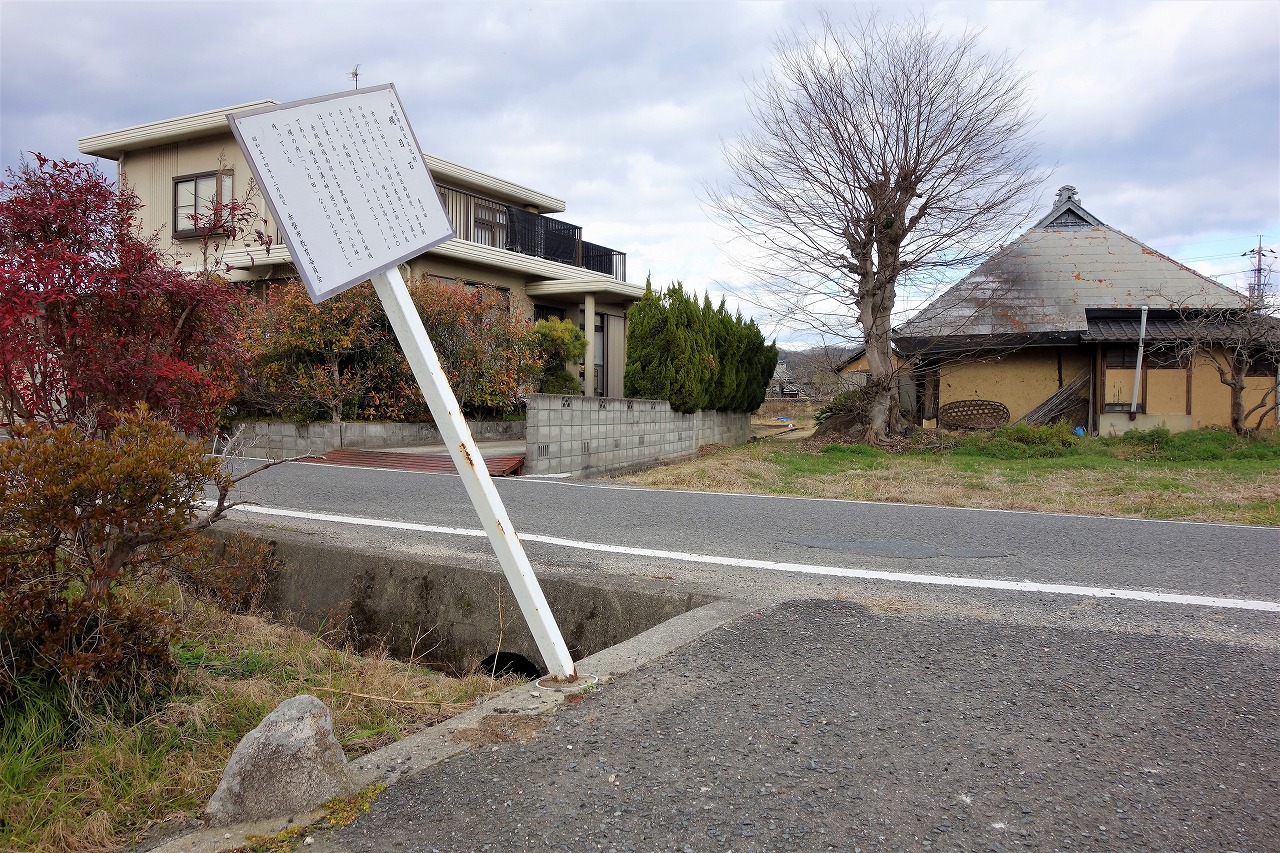 今で言えば三角点のように基準となるポイントであった。とはいえ、棚田のようにぱっと見で形状が分かるわけではない。そこで、ここに来るまでの道を思い出してみよう。東窪田地内を県道27号岡山吉井線が南北に貫いている。南から来た私は写真に写る道に入るために東窪田交差点で左折したが、直角にではなく斜めに進んだ。