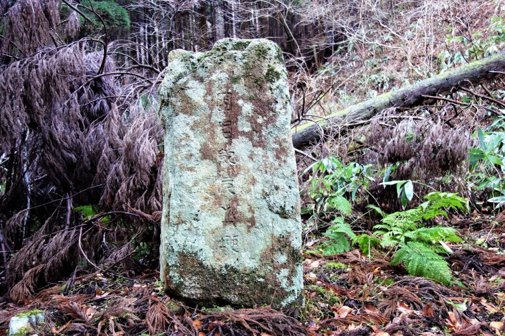 私が目指していたのは、山頂でも眺望でも三角点でもない。国名起源の碑という美作=三坂説の遺物であった。山頂にあるものと思って急坂に耐えてきたのにどこにもない。息を整え冷静になると、十国茶屋ではと気付いた。そっち方面に下り始めたがすぐに足を止めたのは、急坂の木にくくりつけた上着を思い出したからだ。同じコースを引き返して上着を回収し、大山みちに合流して十国茶屋跡に向かった。