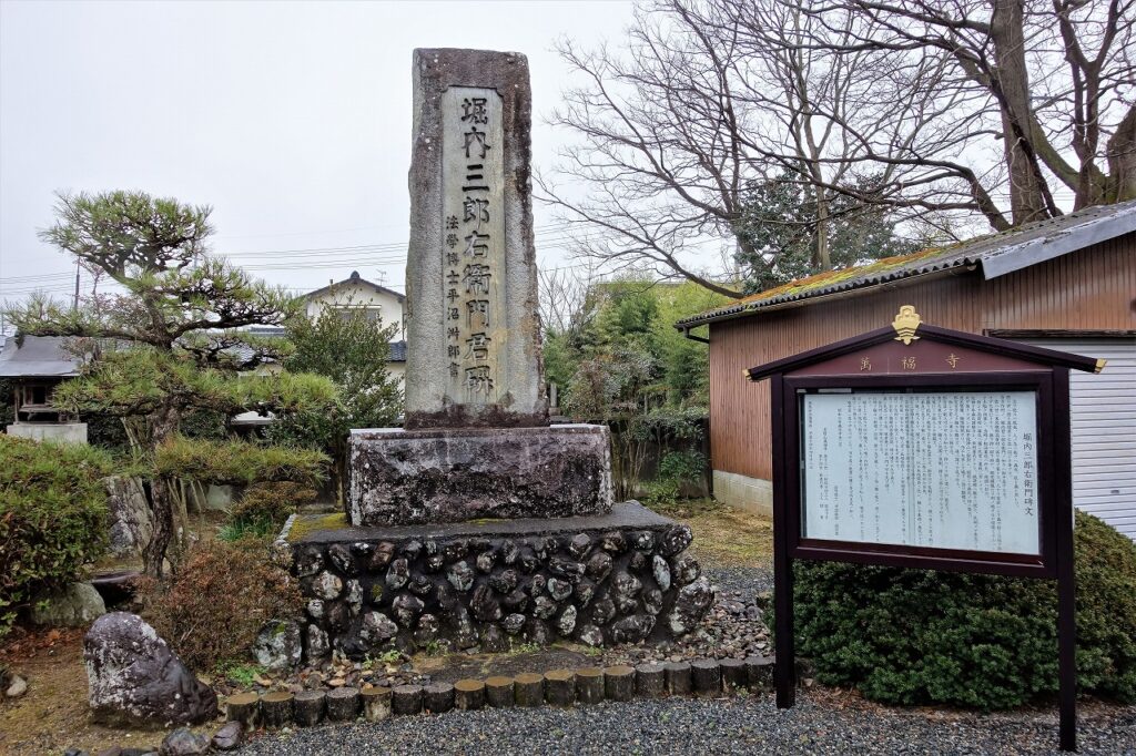 津山市高野本郷の萬福寺に「堀内三郎右衛門君碑」と刻まれた顕彰碑がある。昭和六年に建てられた。揮毫は「法学博士平沼淑郎」で、津山藩士平沼家出身で平沼騏一郎首相を弟に持つという学者である。