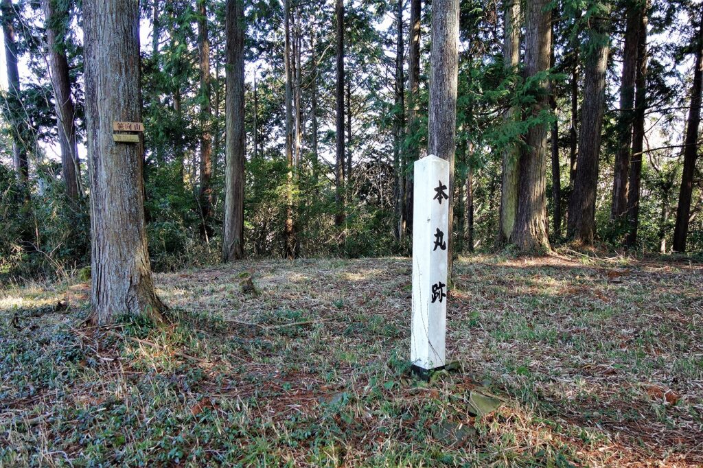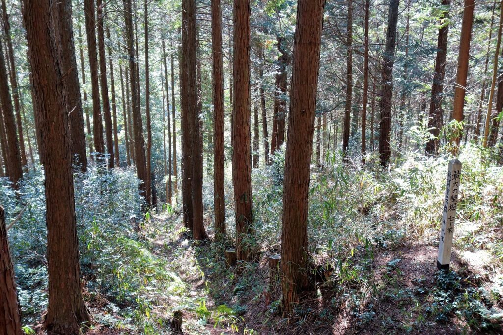 真庭市三崎に「篠向(ささぶき)城跡」がある。写真は頂上にある本丸跡で、立木には「笹向山(ささぶきやま)419M」と記された標識が取り付けられている。