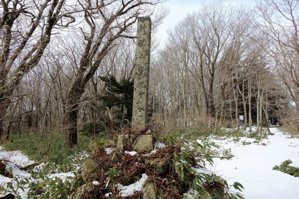 よしと思って叩くと、ペチペチと痛いだけであった。もう少し硬いもので打つと、節理の隙間に反響して響くのだろうか。そのまま道を進むと「神聖之宿処」の石碑まで戻ってきた。あとは帰るのみ。斜面には雪が積もっているので、ザックザックと跳ぶように下りた。雪の柔らかさが優しく感じられる。