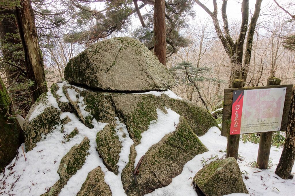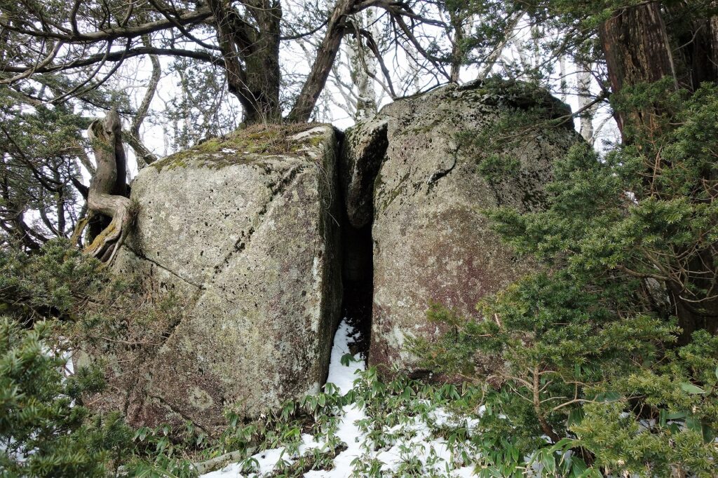この巨石は産子の岩戸と呼ばれる。いまにも赤子を産み落とそうとする姿に似ていることからこの呼び名があると伝えられる。