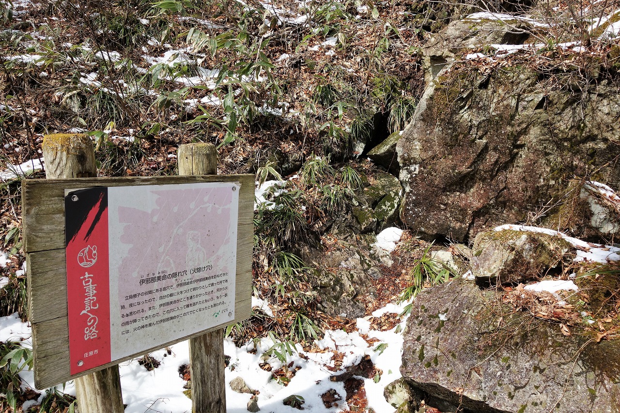 三つの説が紹介されている。最後の説はイザナミ終焉の地ということになる。最初の説はその後日談で、イザナギは直後にトンデモないものを目にすることになる。黄泉比良坂(よもつひらさか)の神話は古墳の横穴式石室からの連想だが、ここは古墳ではないので「隠れ穴」が妥当なのかもしれない。