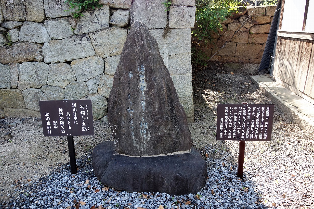 赤穂義士、神崎与五郎則休はもと津山藩士。森家の改易で赤穂浅野家に仕官した。刃傷事件で仇討ちに加盟、江戸で吉良家の動静を探る討ち入り前の元禄十五年(一七〇二)秋、故郷徳守宮の祭礼をしのんで詠んだ。なお母堂の墓は愛染寺にある。