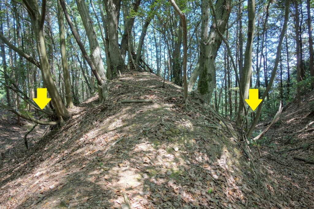 大仙山は登城路のある東側は険しいが、西側には尾根が伸びている。このため西側からの攻撃を想定した造りとなっている。近くには横堀と畝状竪堀を組み合わせた施設があり、山城ファン必見の見どころだ。