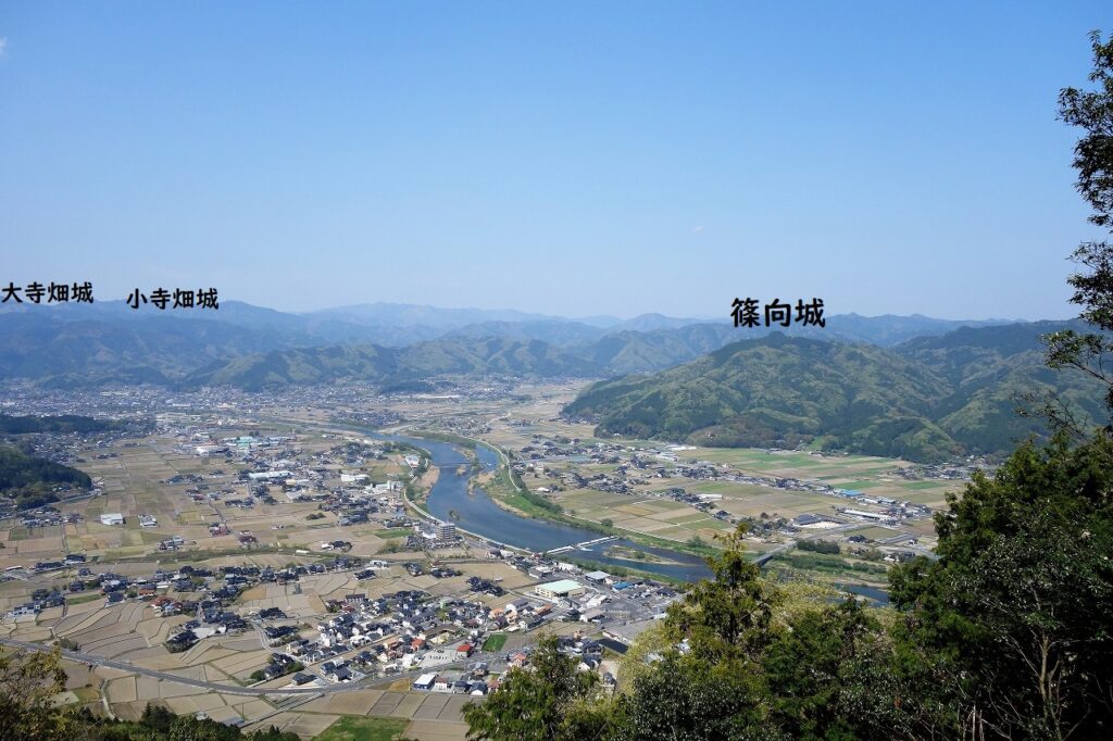 「三の丸からの展望」はご覧のとおり。出雲街道が通過する久世盆地を一望でき、攻防の舞台となった山城を視認できる。