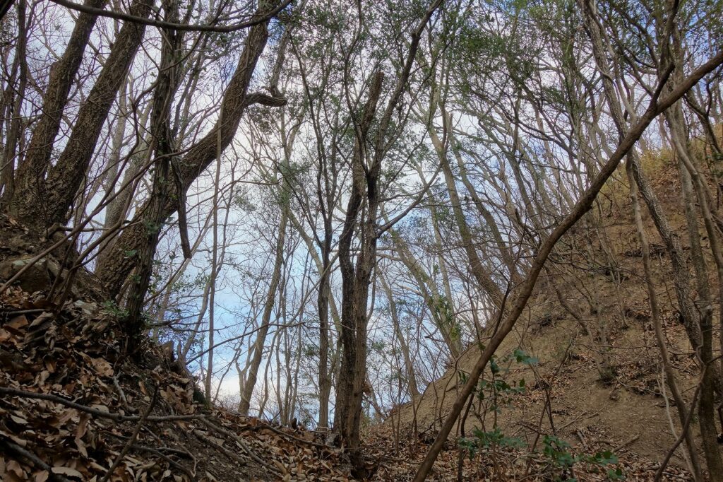 頂上手前で突然、大堀切に行く手を阻まれた。『岡山県中世城館跡総合調査報告書(備前編)』によれば、深さは約8mを測るという。斜面に茂る木をつかみながら堀底から上がったが、その当時なら守備兵の射掛ける矢でたちまち転げ落ちたに違いない。