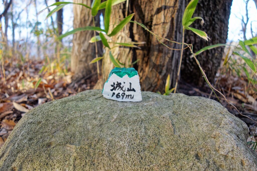 標高169mだから登りやすい。登城口は西側、写真では右手の谷にあり、頂上背後に見える鉄塔に向かう巡視路をたどる。鉄塔までは楽だが、そこから先が急峻、敵の侵入を防ぐ構造だ。