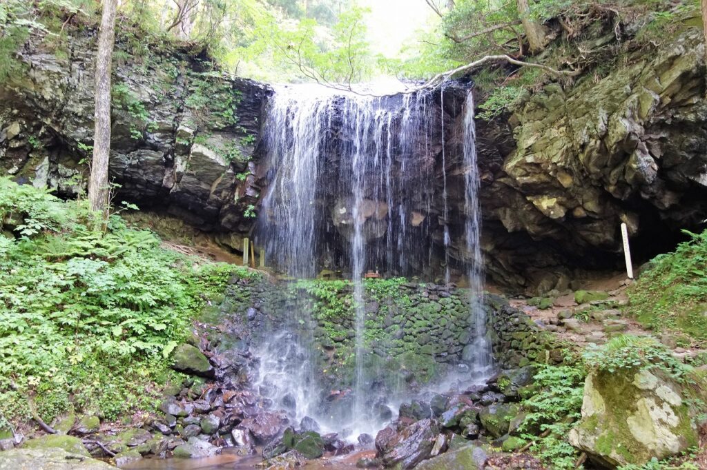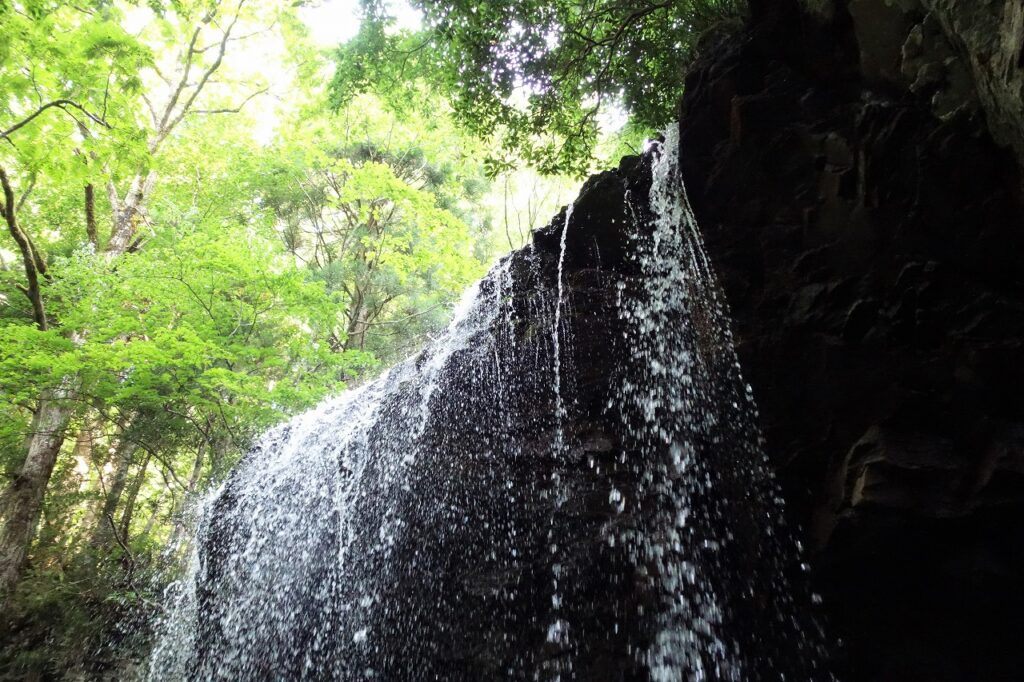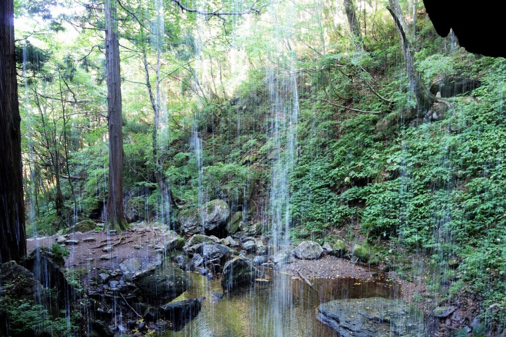 涼を呼ぶ観光名所として知られているが、この日は朝早いからか誰一人会うことがなかった。裏から見えるように岩盤を刳り抜いたのではなく、自然の造形である。ただし、見学がしやすいように通路が整えられ、盛り土で滝見台が設けられている。