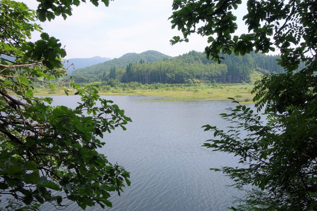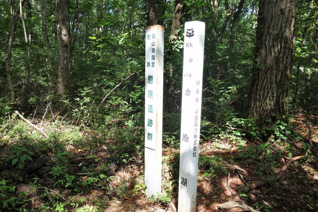 岡山県苫田郡鏡野町上齋原に県指定史跡の「恩原遺跡群」がある。右側の標柱には「町指定名勝 恩原湖」とある。昭和3年に完成したダム湖である。静かな湖畔の森の陰に遺跡がある。
