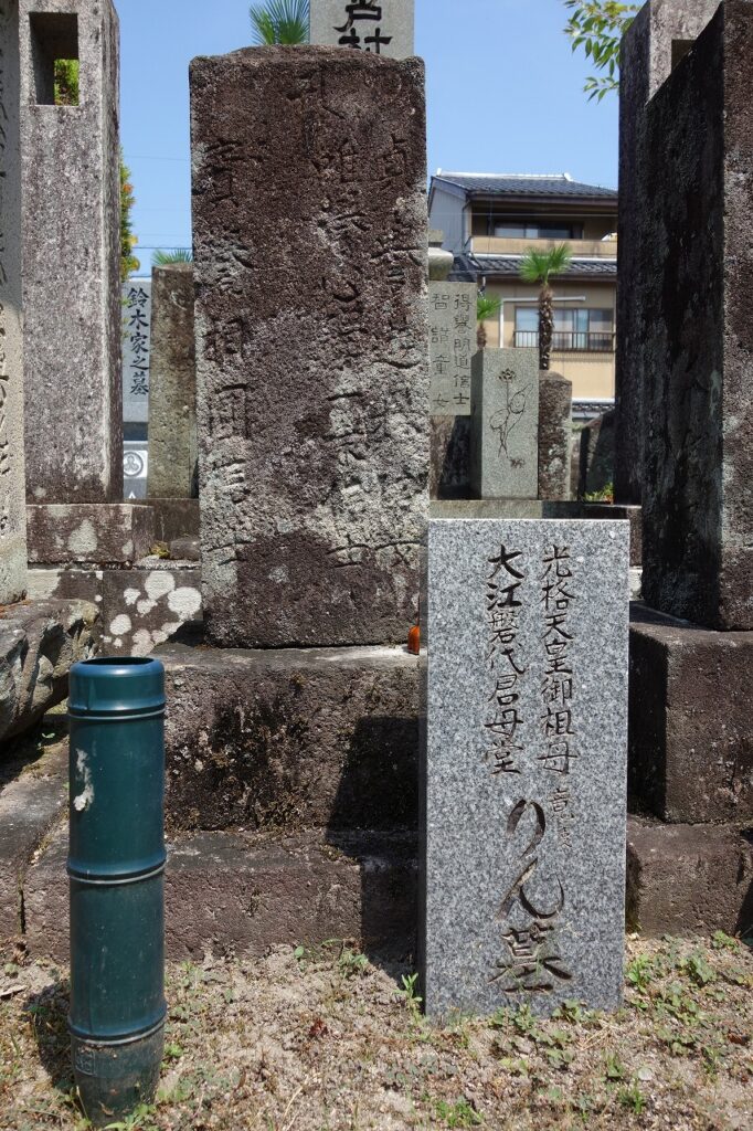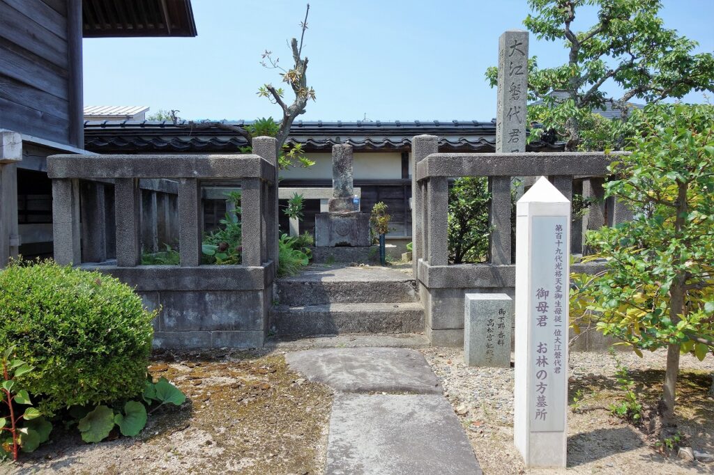 倉吉市新町1丁目の大蓮寺に「光格天皇御祖母 大江磐代君母堂 竟こと りん墓」と示された標柱があり、その後ろに墓碑がある。