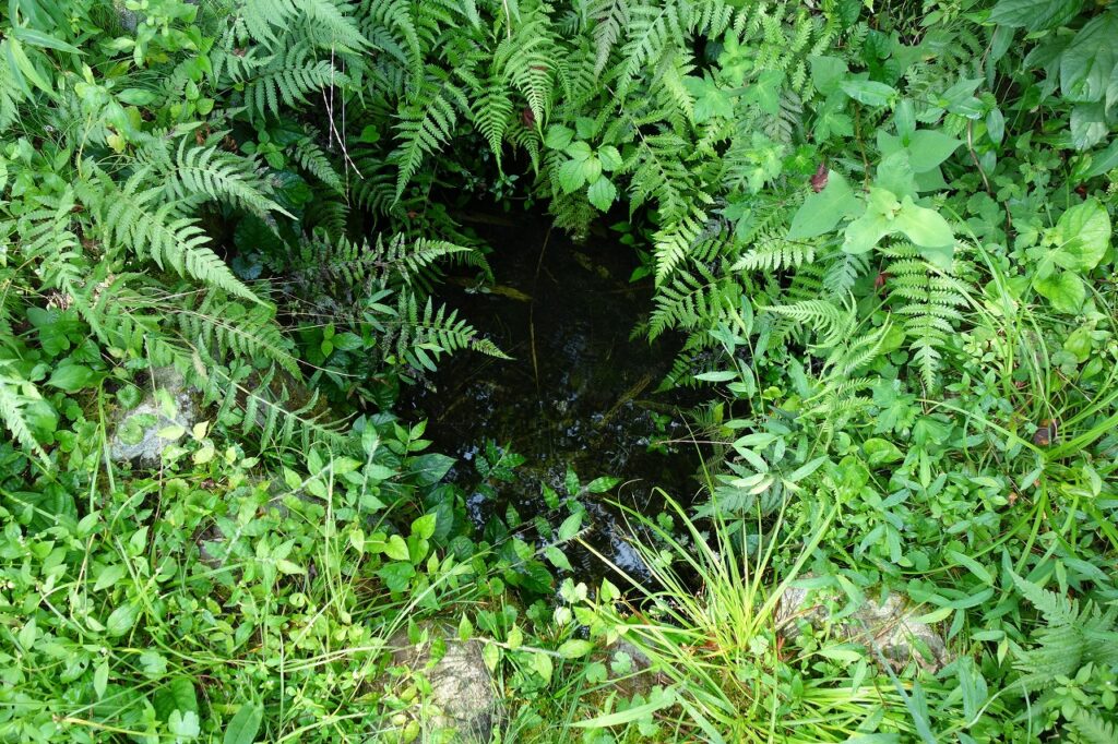 夏草に覆われているから、説明板がなければ見つからなかっただろう。そっと覗くと空が反射して見えた。千年以上の昔からここに水を湛えてきたのか。説明板を読んでみよう。