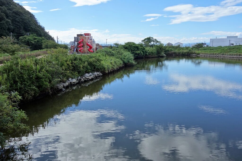 水辺にあるこの美しい公園は、かつての千代川なのだ。現在スーッと北上して日本海に注ぎ込む千代川は、昭和になるまで下流部で大きく湾曲していた。地形図を見れば八千代橋のあたりから重箱緑地方面にかけて旧河道を確認できる。遊具近くにある説明板を読んでみよう。