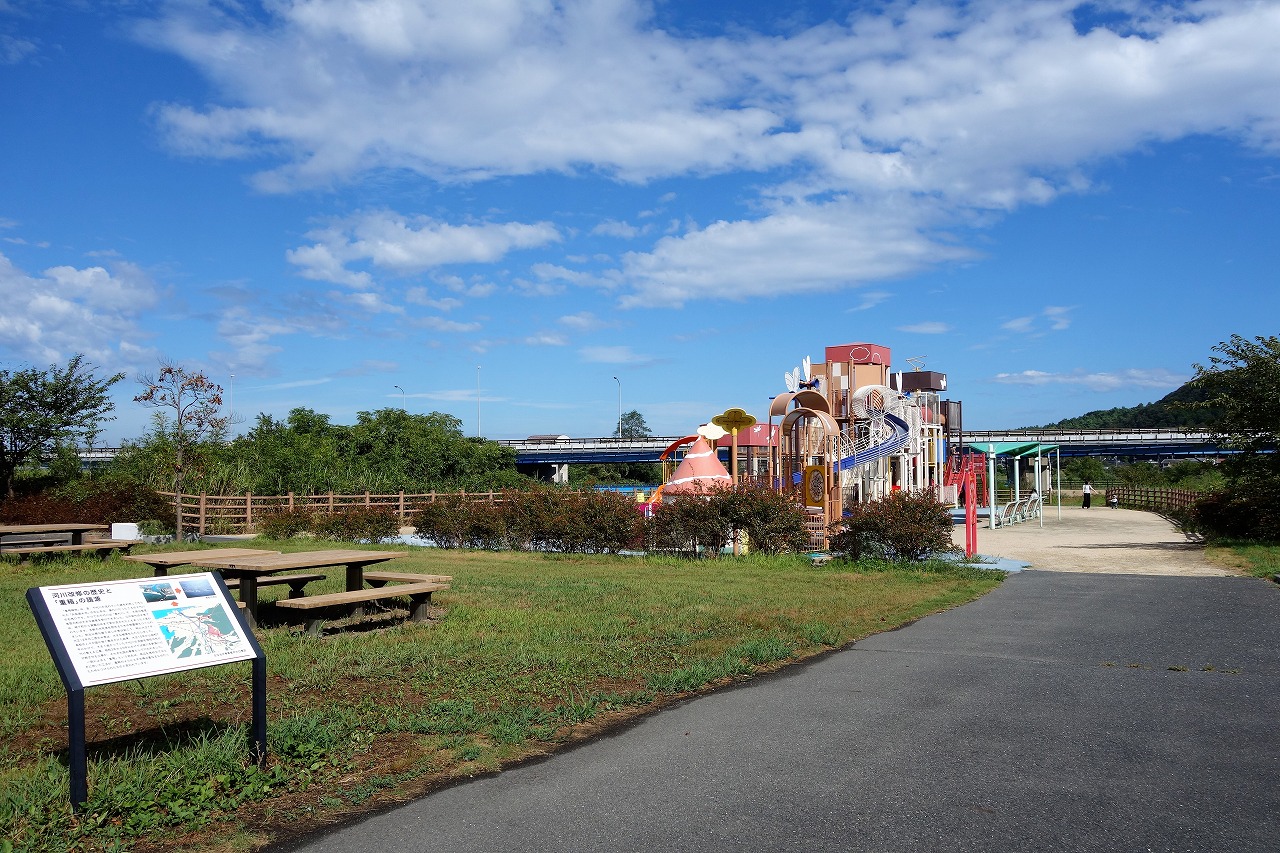 水辺にあるこの美しい公園は、かつての千代川なのだ。現在スーッと北上して日本海に注ぎ込む千代川は、昭和になるまで下流部で大きく湾曲していた。地形図を見れば八千代橋のあたりから重箱緑地方面にかけて旧河道を確認できる。遊具近くにある説明板を読んでみよう。