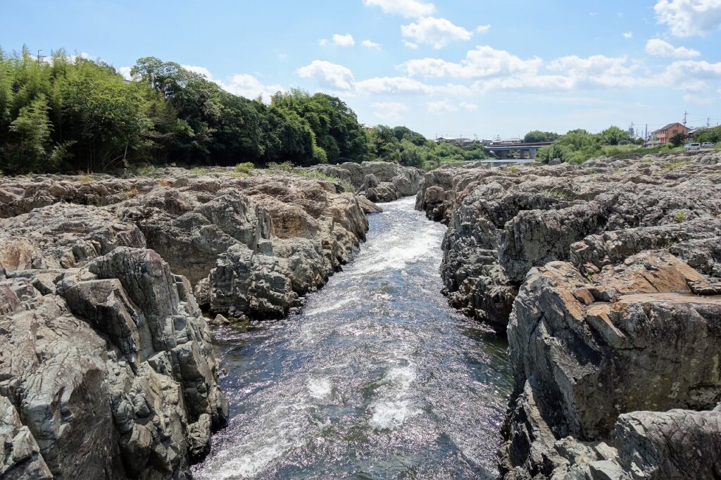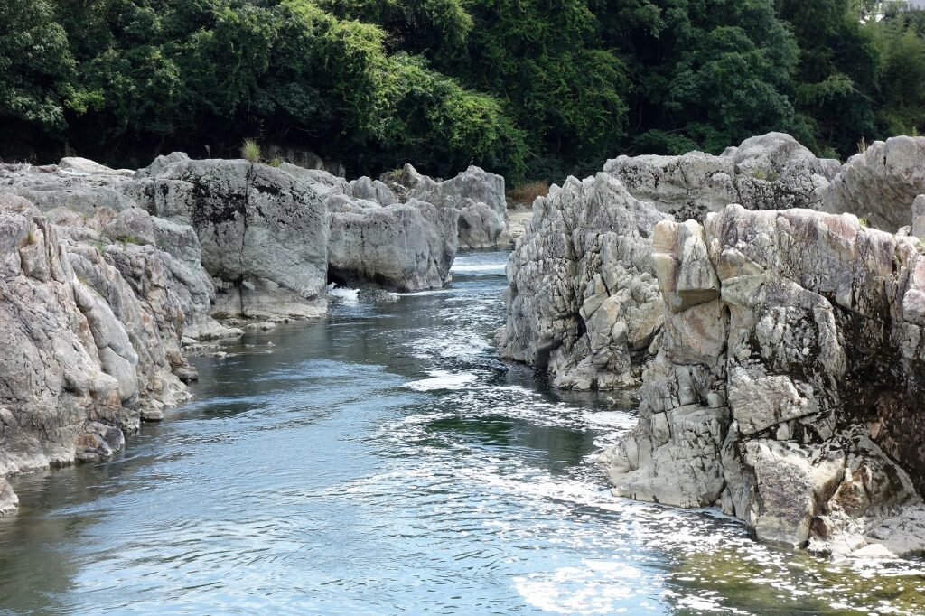 変化に富んで美しい景色が続く。岩盤の東側にまっすぐな河道があり、「掘割水路」と示された説明板が岩に貼り付けられている。