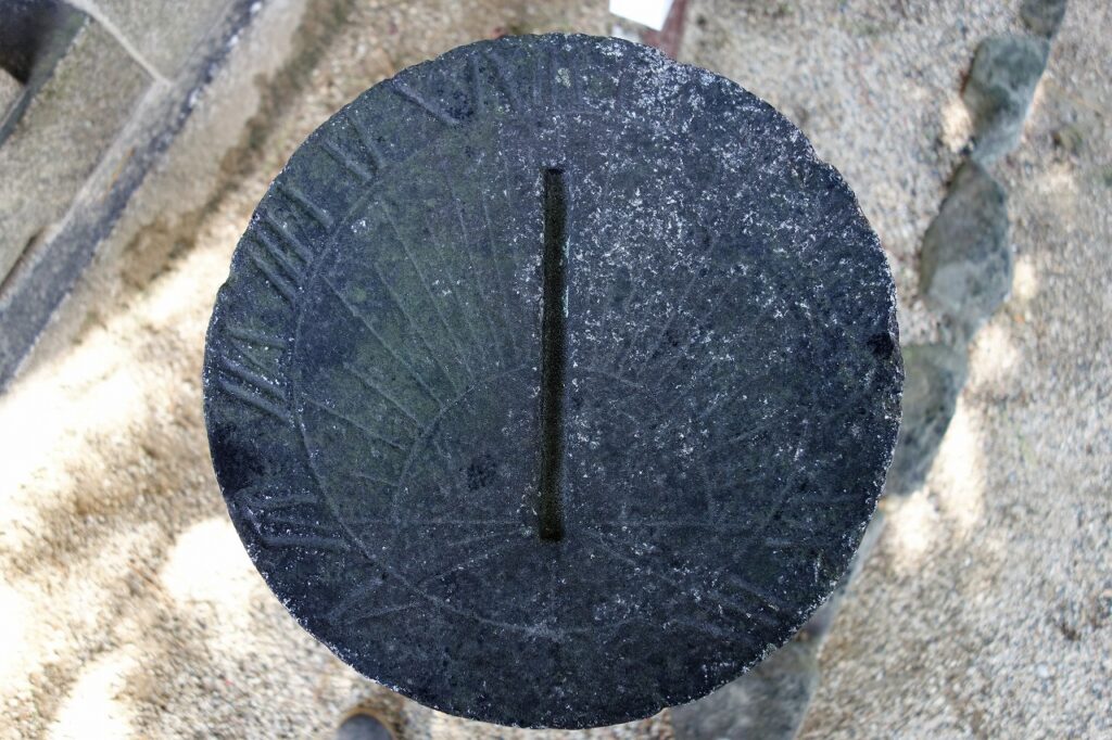 円形の日時計が八角形の石柱に乗る。石柱の南北面には緯度、西面には英国からの東経、東面には東京からの西経が記されている。そして北西面に「紀元二千五百三十六年四月建設」、北東面に「駸々社中」と記され、明治九年(一八七六)四月に駸々社中が建てたことが分かる。駸々社中とは、淡路の福沢諭吉と称される安倍喜平が文明開化推進の為に結成した組織で、安倍喜平の家塾「積小軒」の門下生からなる。