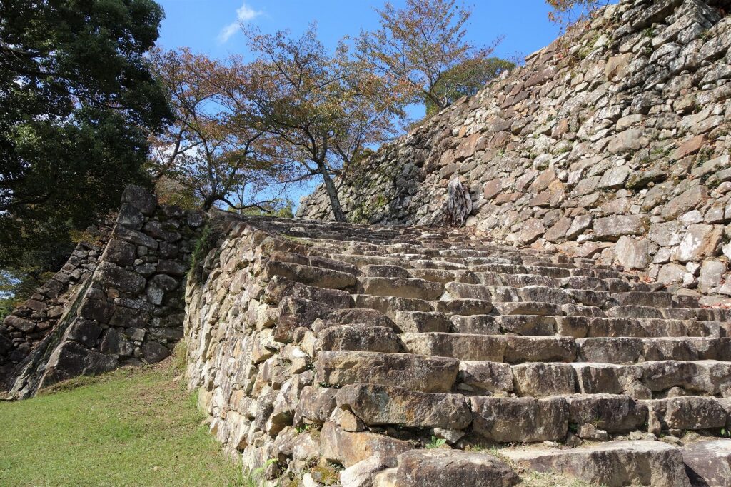 これは「本丸大石段」である。規模は近世城郭だが、石の積み方に古さを感じる。いったい、いつ誰が築いたのか。説明板には次のように記されている。