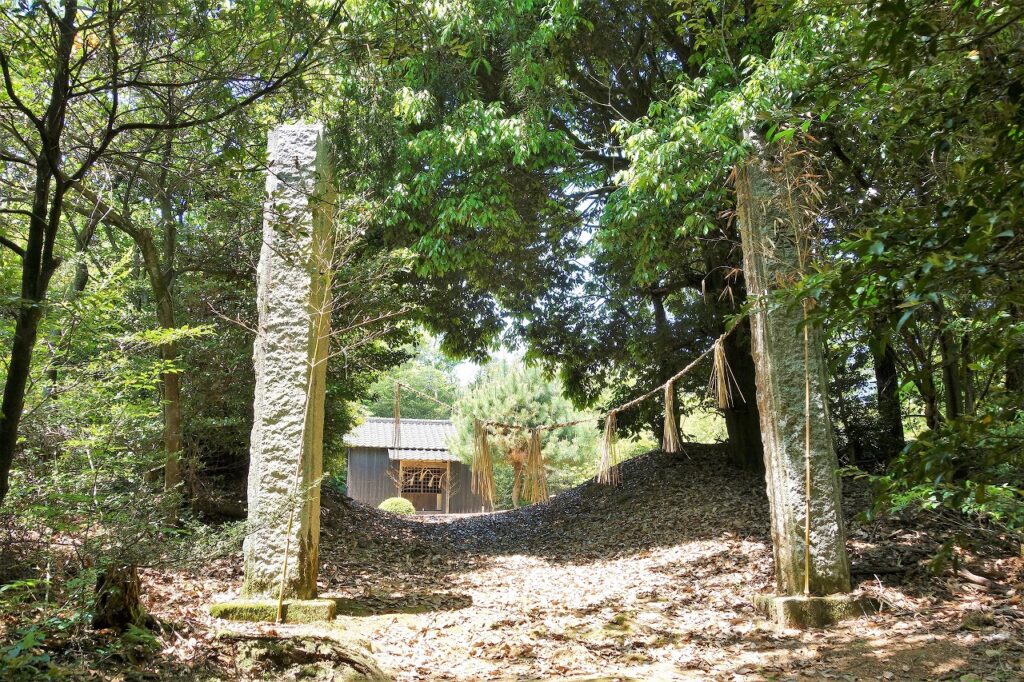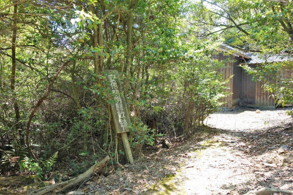 人里離れた場所ではないが、狭い車道をけっこう登らねばならない。車を停めて山道をしばらく歩くと神社がある。境内の説明板を読んでみよう。