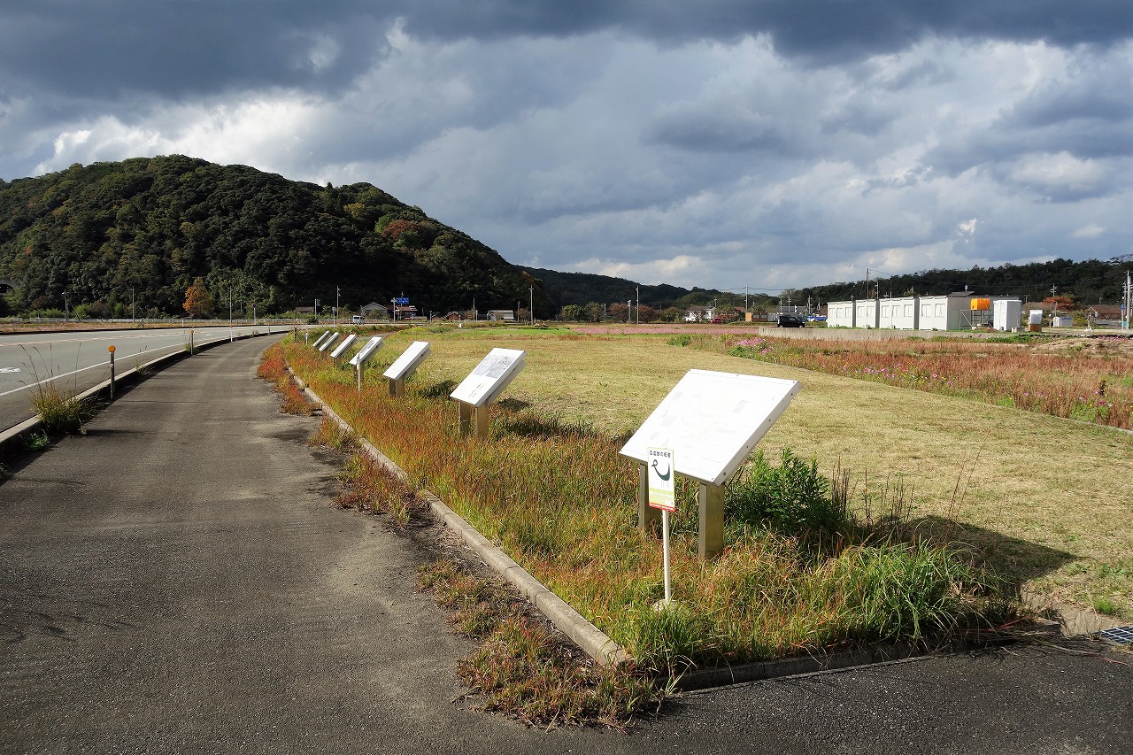 この遺跡は山陰自動車道建設に伴う発掘調査で発見された。2000年に大量の人骨が出土し、そのうち3体の頭蓋骨から脳が見つかったことが翌年4月に明らかにされた。数ある弥生遺跡の中では、まことに稀有な例である。一番手前の説明板には、次のように記されている。