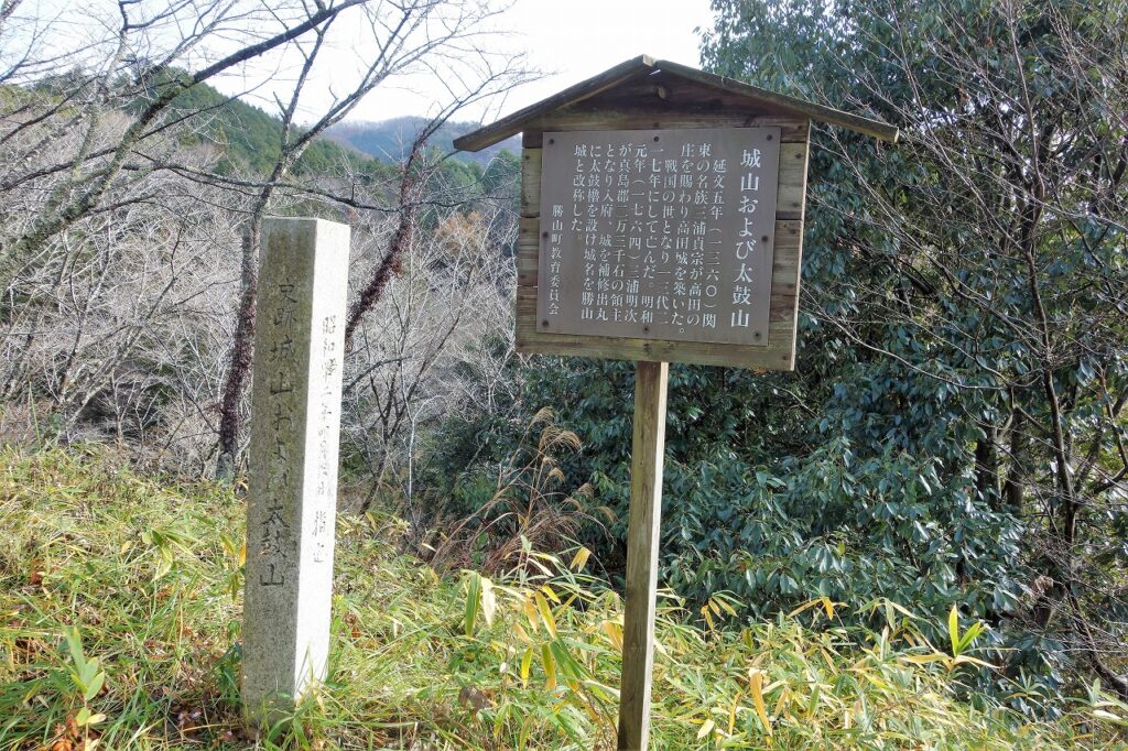 近世の調練場だったというグラウンドに沿って歩いていると、「史跡 城山及び太鼓山」「昭和四十二年四月六日 指定」と刻まれた標柱がある。どうやら旧勝山町時代は、そのような史跡の名称だったらしい。説明板には次のように記されている。