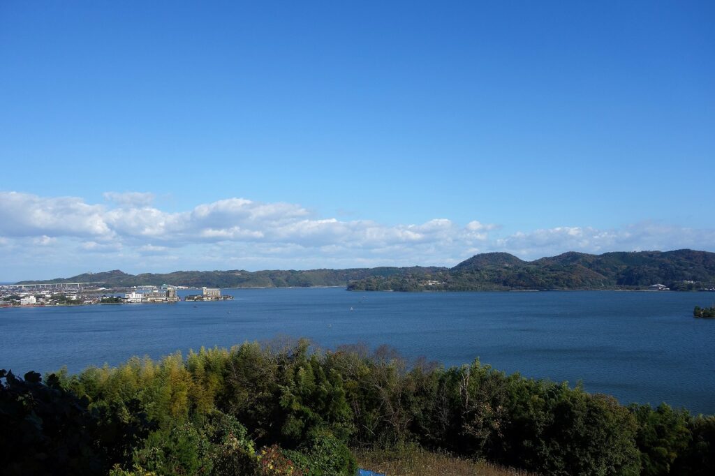 後円部が窪地になっている。ごっそり持って行かれてしまったのだろうか。右奥に前方部があるが薮化して入れない。写真の左、木の陰に石棺らしきものが見える。最大級という大きさこそ実感できないが、立地条件はよい。レイクビューのこの眺望だ。