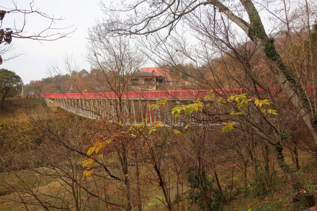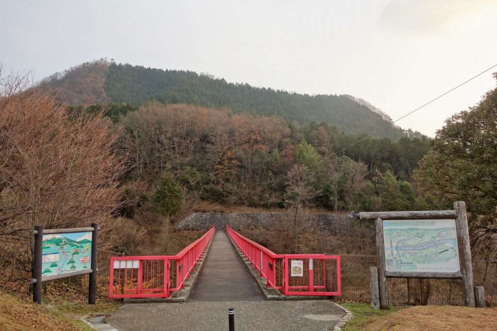 目指すは正面に構える台形の山、その左端が第一の目標だ。赤い橋の名は「天空橋」。なんでもない橋に見えるが、渡って振り返ると、アーチ橋をひっくり返したような構造が見える。