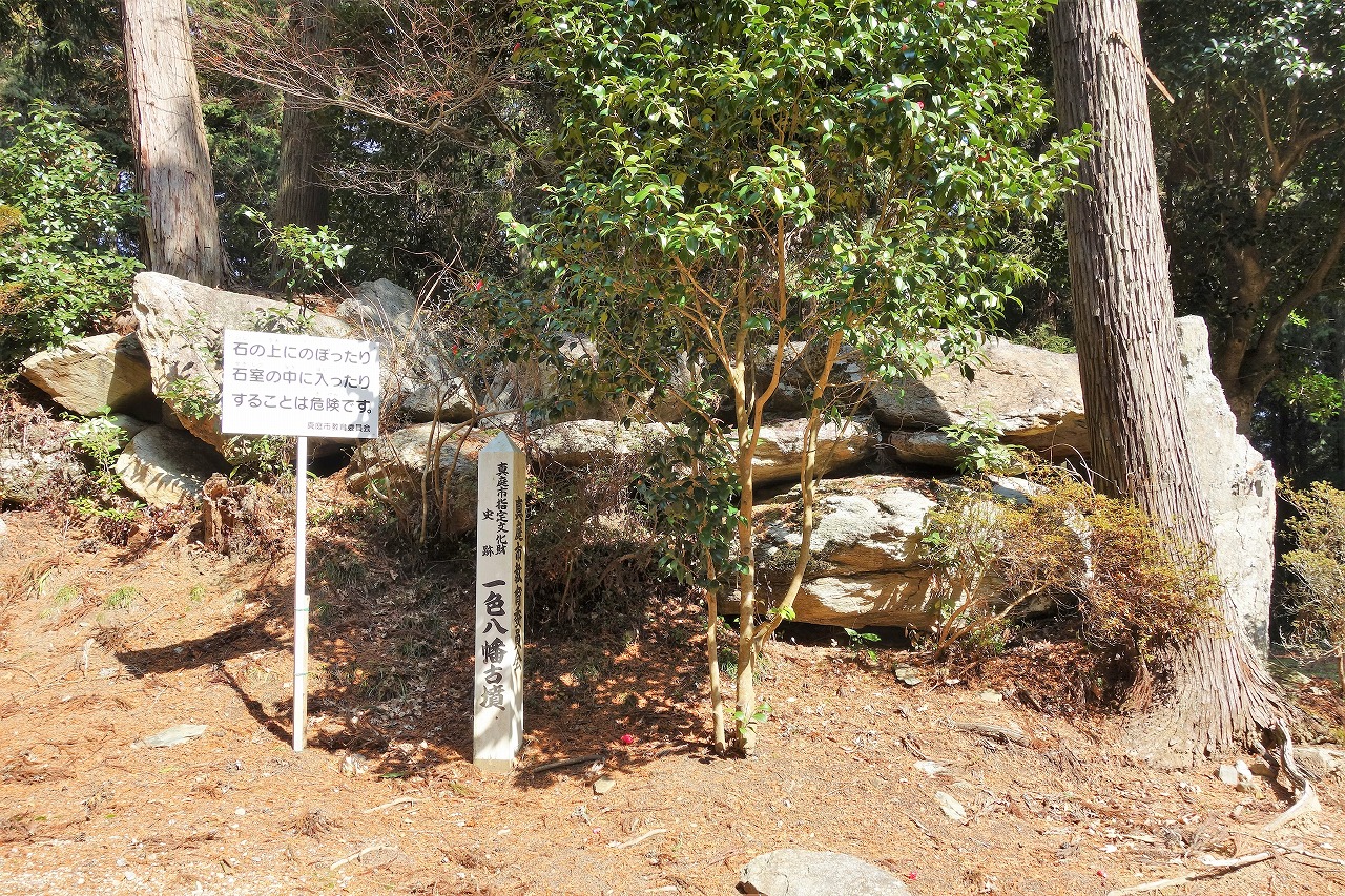 一色八幡神社の境内に位置しています。墳丘は流出し横穴式石室が露出しています。南南東に開口する無袖の横穴式石室で、羨道の一部が失われているものの保存状態は良好です。現状での石室規模は、長さ約9m、幅1.7mを測ります。備中川中流域では最大級の巨石墳で、東西交通の要衝を押さえていた有力な被葬者の性格がうかがわれます。築造時期は6世紀後葉~7世紀頃です。