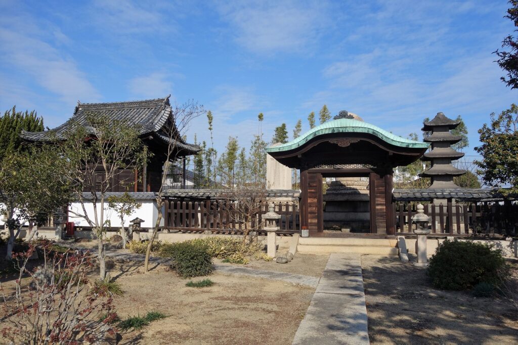 平和な干拓地に眠る二人のお殿さま。藩主時代はいろいろあって心休まる間もなかっただろう。芋墓は寺の外からもよく見える。岡山平野は旭川と池田の殿さまのおかげと感謝し、ささやかながらこの一文を捧げたい。