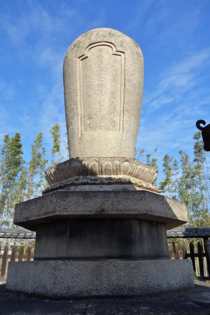 忠継廟の隣に弟忠雄の「芋墓」がある。確かにサツマイモか里芋の親玉のようだ。墓塔としては無縫塔という。古さを感じさせない美しい墓碑で、犬島産の花崗岩とのことだ。左隣の巨大な板碑のような慕塔は殉死した加藤主膳正、右の五重塔は奥方の芳春院の慕塔である。五重塔は加工しやすい豊島産凝灰岩でできている。岡山市教委の説明板を読んでみよう。