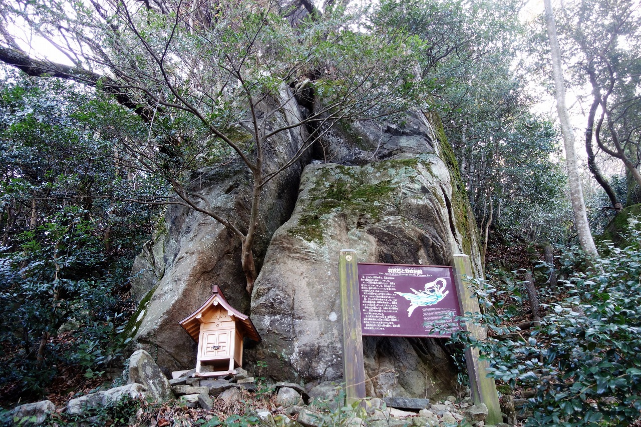 羽衣石(はごろもいし)の下に天女の祠を祀り、毎年5月5日を祭日としています。