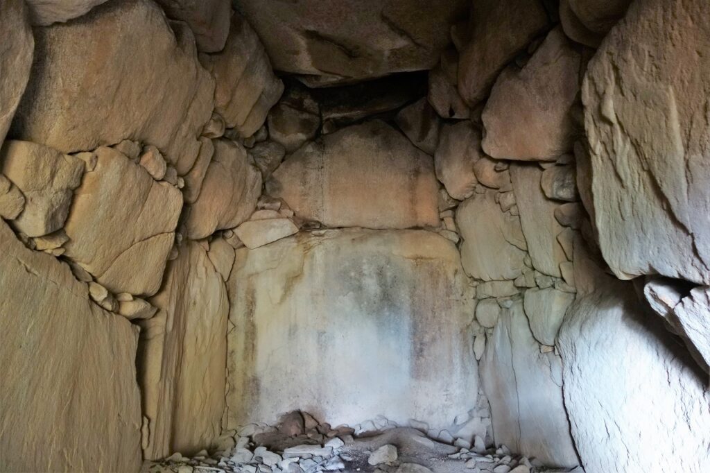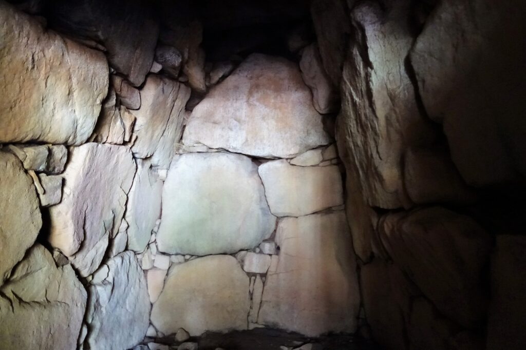 それほどには見えない開口部から石室に入って驚いた。巨大な空間と精緻な石積みである。説明板を読んでみよう。