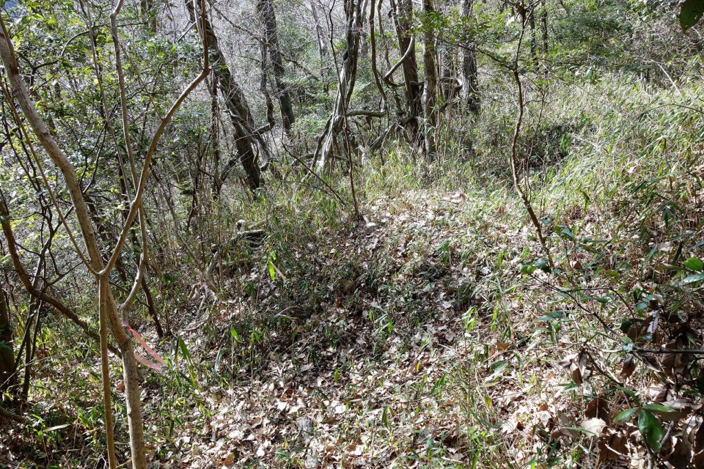 丘陵の頂部に主郭、その北側に北郭、東側の尾根に二の郭が位置し、郭が連なる形式(連郭式)を持った山城でした。また、郭からは竪堀が要所に多く掘られており、防御を意識した構造になっています。