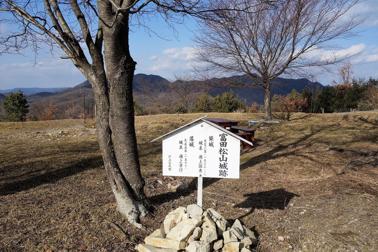 虎満丸を補佐したのが一族の浦上国秀であった。国秀は若き当主をよく支えたようだが、やがて政宗は弟宗景と対立し滅ぼされてしまう。その国秀が築いたのが、富田松山城である。山頂の立札には次のように記されている。